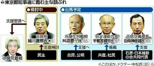 猪瀬直樹前都知事の金銭スキャンダル辞任に伴う都知事選。候補者の顔触れも見え始めて、都民は新たな選択をしなくてはならない。 …最有力候補と下馬評の高いのが舛添要一元厚労相。厚労相や自身の介護経験から高齢化社会への対応や議会対応は巧く出来る期待…