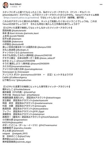 ケント・ギルバートさんがFacebookで公開している情報である。 https://m.facebook.com/kent.gilbert.5/posts/1564890076935180 ケントさんによると、一部の著名な保守系論客のTwitterアカウントは 「Yahoo!リアルタイム検索で『つぶやいた言葉で検索しても…